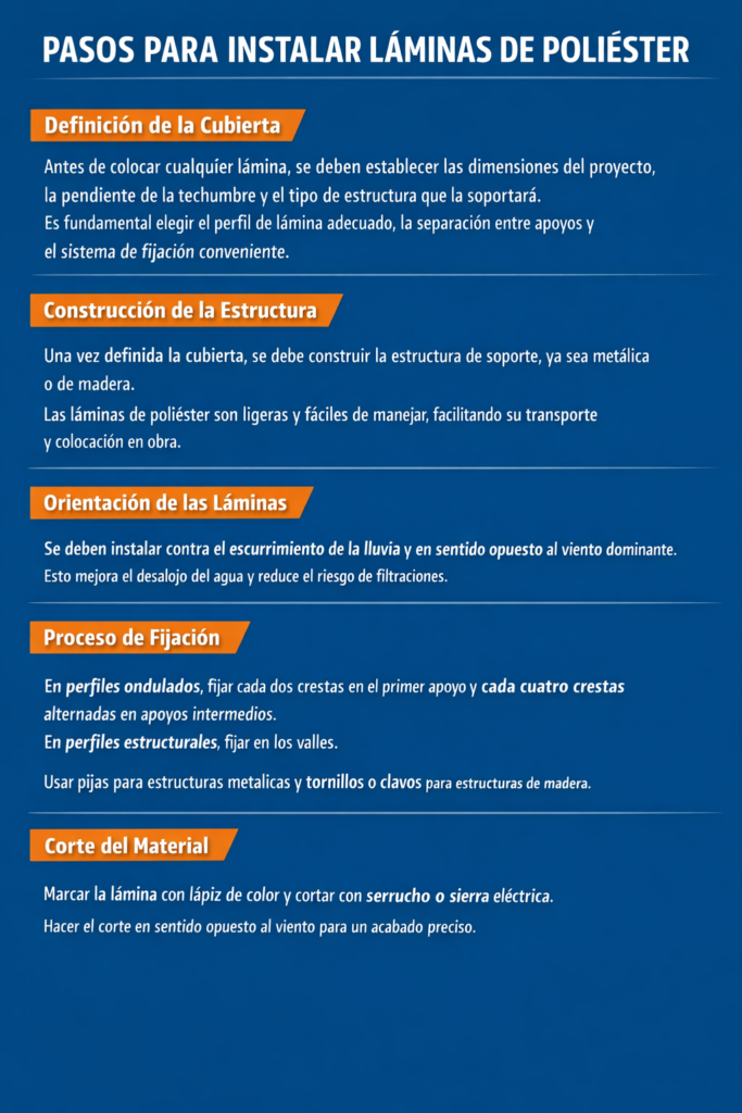 La instalación correcta de una lámina de poliéster es clave para aprovechar todos sus beneficios. Por ello, una buena guía de instalación no solo ayuda a lograr un montaje más eficiente, sino también a prolongar la vida útil del material y a mejorar el desempeño de la cubierta con el paso del tiempo.